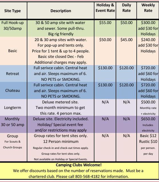 - Special discount to all qualifying Camping Clubs, including reserved use of clubhouse or pavilion. Excluding holidays. Call for details.